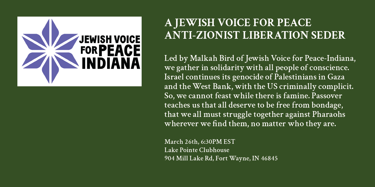 Led by Malkah Bird of Jewish Voice for Peace-Indiana, we gather in solidarity with all people of conscience. Israel continues its genocide of Palestinians in Gaza and the West Bank, with the US criminally complicit. So, we cannot feast while there is famine. Passover teaches us that all deserve to be free from bondage, that we all must struggle together against Pharaohs wherever we find them, no matter who they are.